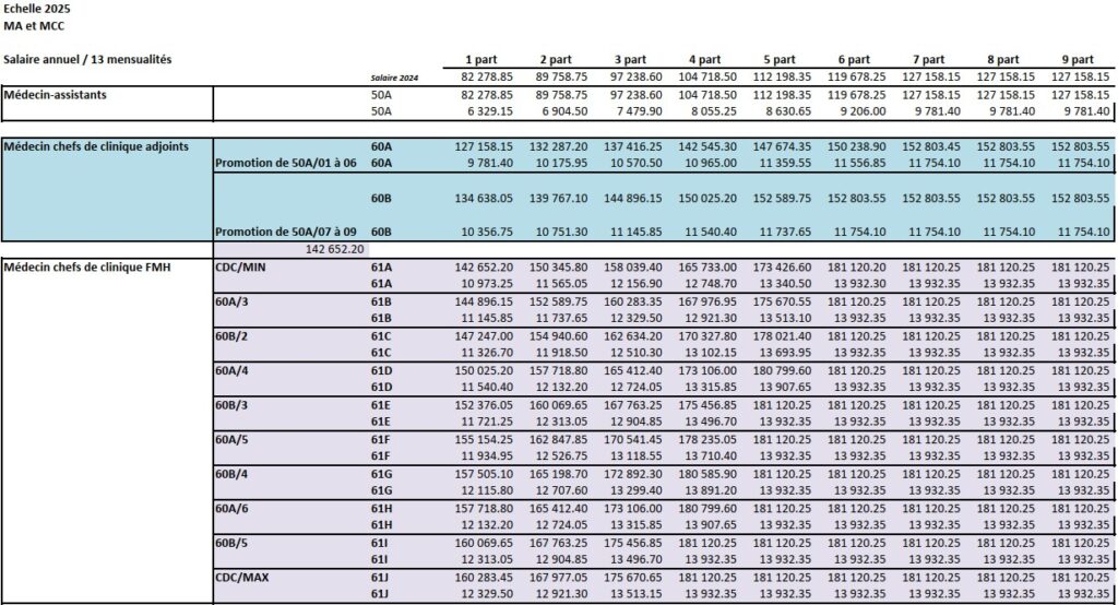 - Chef de clinique adjoint de CHF 120’934.- à CHF 150’126.- avec une progression de CHF 7’298.- à chaque année de pratique médicale.